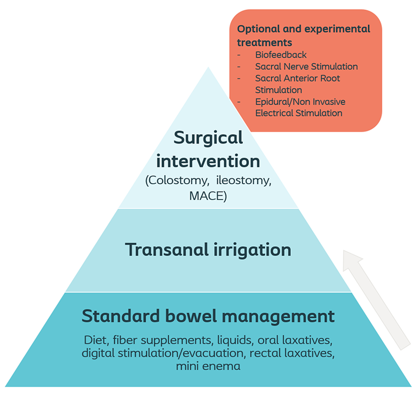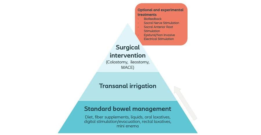 In 2013, the first consensus review describing a 7 stepped approach to the treatment of Neurogenic Bowel Dysfunction (NBD) was published(1). The 7-step pyramid has reached widespread acknowledgement, but it has also shown not to be completely in line with the actual clinical practice. As a response to that, a group of Bowel Care experts (including 3 specialists who also took part in generating the first pyramid) suggest an updated and more simplified treatment algorithm for NBD in SCI and MS patients. In alignment with the best available evidence, the updated pyramid contains only 3 steps covering standard bowel management, TAI, and surgical intervention, while placing the remaining treatment options in a separate box as optional or experimental treatments. These updates are reflective of the existing clinical practice as well as the exploratory state and availability/eligibility of the various treatment options for the individual patient.