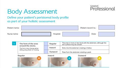 Use this editable PDF to define your patient's peristomal body profile as part of your holistic assessment. Simply open up the form by clicking the download assessment button below, then once you've completed the assessment you can save for your records and print off if required.